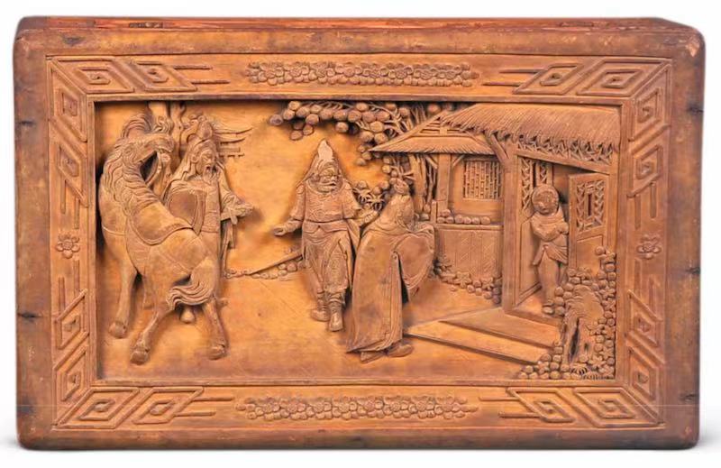 包焕武 香樟木浮雕《三顾茅庐》箱顶面的“刘备、关羽、张飞与童子门前问答”图案 20 世纪 50 年代