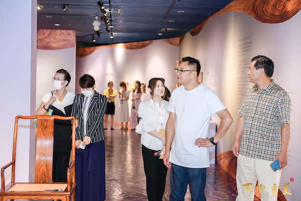 包天伟(右二)在上海中心37层“天地玄黄——包天伟黄花梨艺术展”展览现场