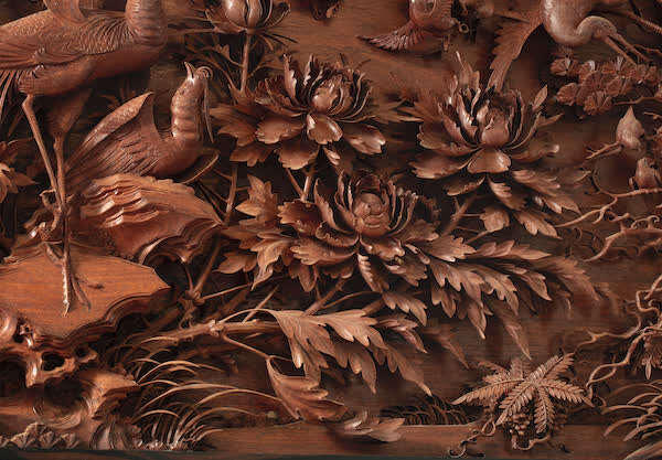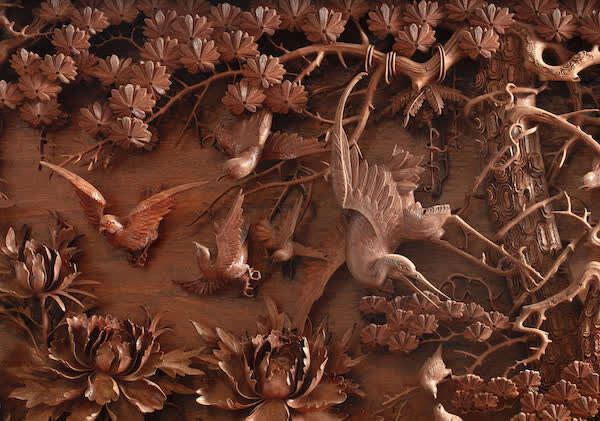 再如乌木镶花梨木雕《凤求凰》挂屏,是包天伟于2008年创作的,作品设计稿为其父包焕武遗作,后由包天伟补完并制作。“凤求凰”比喻男女青年真挚的爱情及家庭和睦的美好祝福。作品采用散点式构图,布局安排均衡合理,通过深浮雕的技法,表现出丰富的层次。百鸟、树木、花卉都刻画得活灵活现,充分体现出东阳木雕的特点。