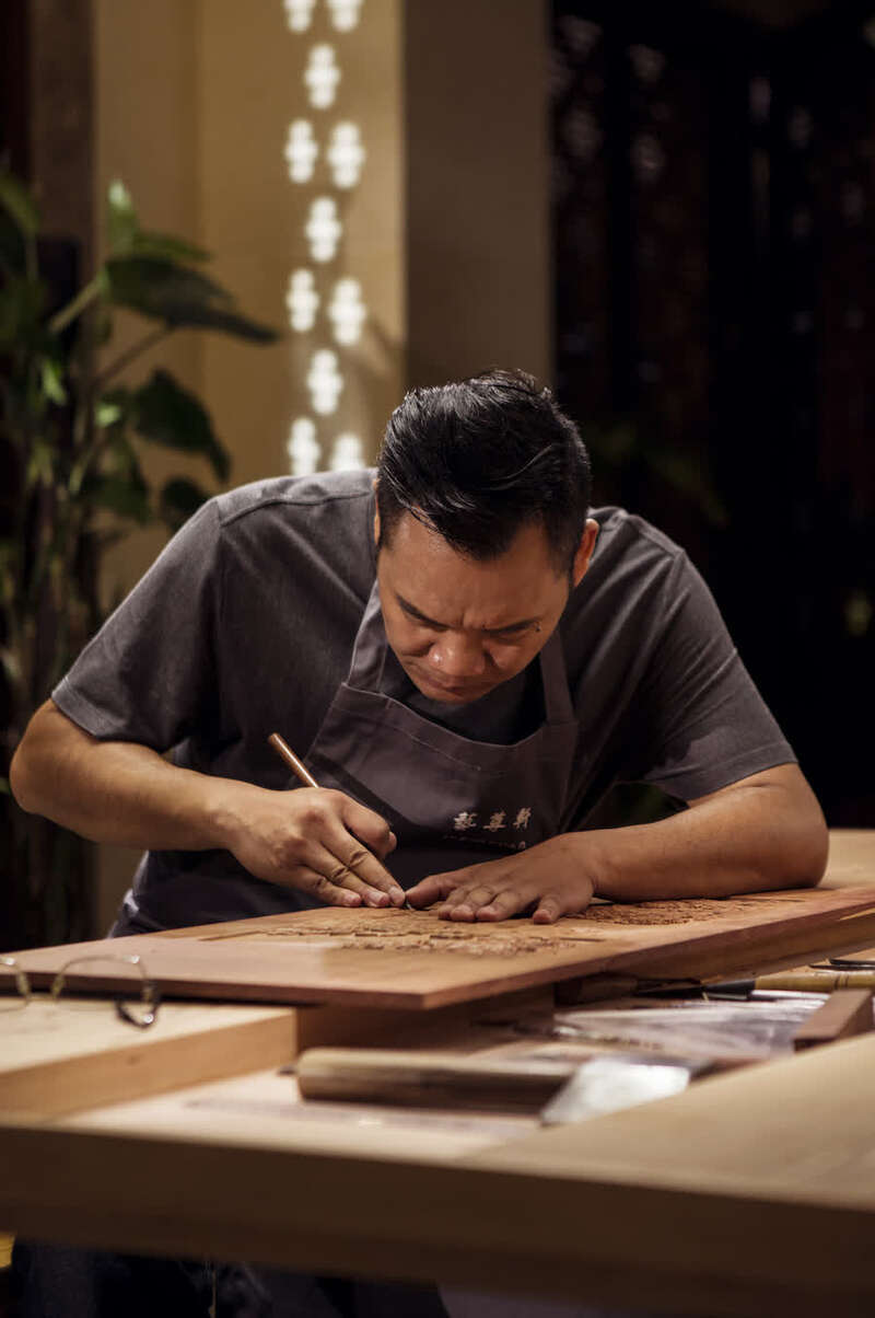 中国工艺美术大师、上海市传统家具制作技艺非遗传承人包天伟在进行木雕