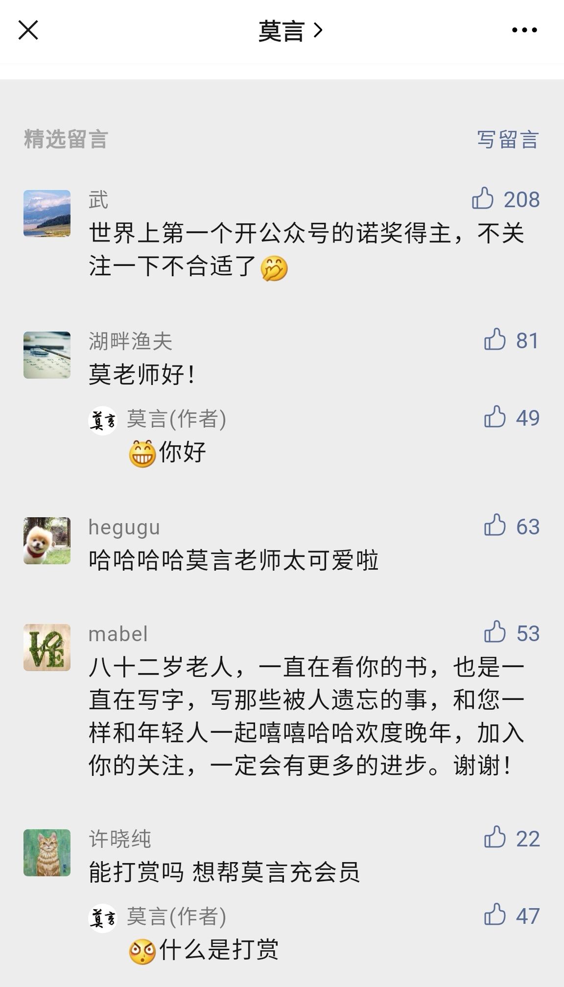 在这条文章的留言中,有网友向莫言问好,莫言也回复了一句“你好”,还加上了笑脸;有网友问:“能打赏吗,想帮莫言充会员”,莫言还问:“什么是打赏”,又配了一个疑惑的表情;有网友就莫言自我形容的三个词表示:“为什么我只有饭量大”,莫言回:“饭量大,身体好。”