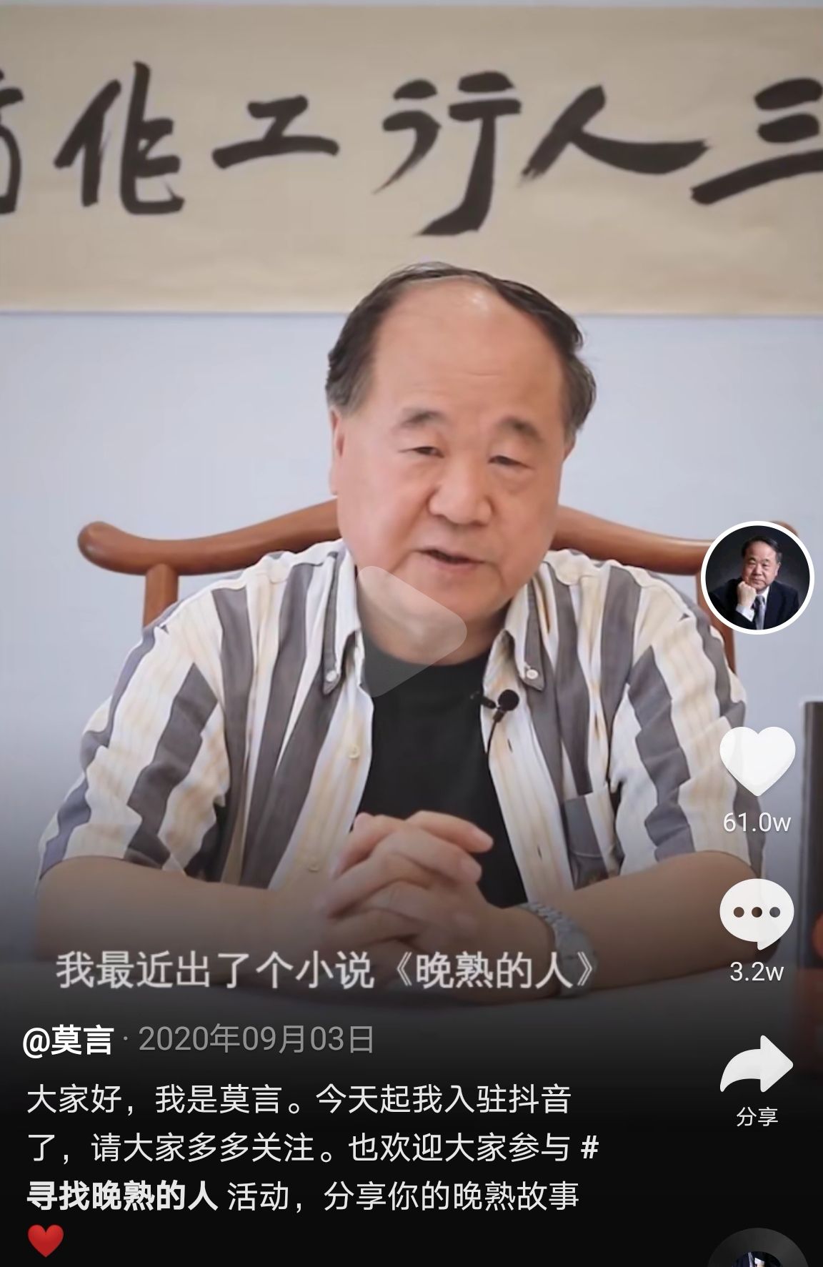 这也不是莫言第一次尝试新媒介。去年9月3日,莫言开设了抖音号,分享新书《晚熟的人》。在第一条短视频发出六个多小时后,该账号已有了10.8万粉丝,该视频也获得了11.3万个赞。他参与了由人民文学出版社和抖音联合发起的话题#寻找晚熟的人,话题一经上线,浏览量于当天突破3100万次,莫言本人抖音视频点赞超35万,12小时销量突破1.5万册。
