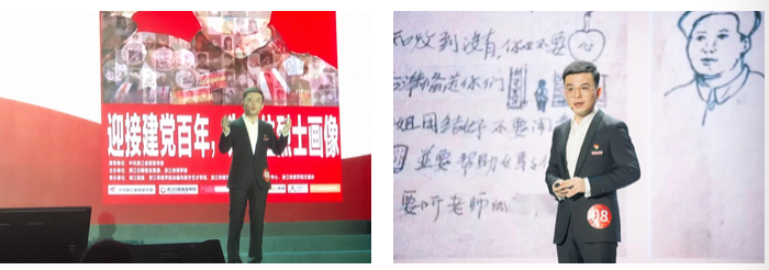 吕老师的党课主题是《英雄青春态 报国进行时》。 他从一副烈士画像开始,讲述了我校与浙江日报报业集团联合发起“为百位烈士画像”大型公益活动,通过师生的画笔专门为牺牲时没有留下照片的烈士进行画像,为烈士遗属圆梦,让更多人敬仰革命先烈、传承革命精神。