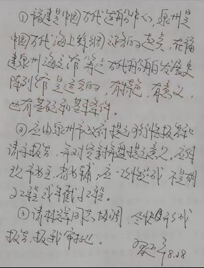 学习小组注意到,专题片中出现了一份习近平的亲笔批示。这份20多年前的批示,全文近150字,肯定了福建泉州筹建古代船舶发展史陈列馆的做法。今天的故事,就从这份批示讲起。