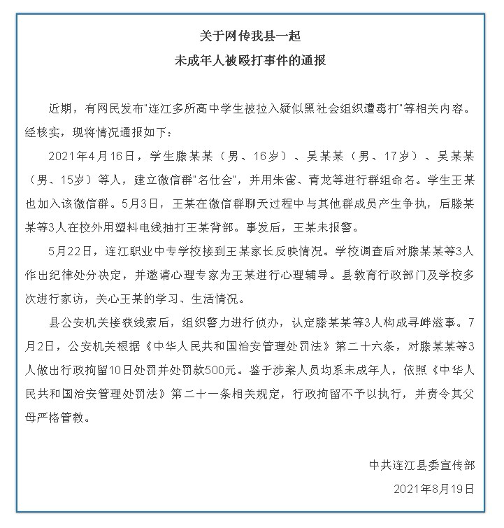 此前,网上流传有关“连江多所高中学生被拉入疑似黑社会组织遭毒打”的信息。连江县委宣传部今天发布通报对此进行了澄清。 通报称,4月16日,学生滕某某(男、16岁)、吴某某(男、17岁)、吴某某(男、15岁)等人建立微信群“名仕会”,并用朱雀、青龙等进行群组命名。学生王某也加入该微信群。5月3日,王某在微信群聊天过程中与其他群成员产生争执,后滕某某等3人在校外用塑料电线抽打王某背部。5月22日,连江职业中专学校接到王某家长反映情况,学校调查后对滕某某等3人作出纪律处分决定。当地警方认定滕某某等3人构成寻衅滋事,遂于7月2日对滕某某等3人做出行政拘留10日处罚并处罚款500元。鉴于涉案人员均系未成年人,依照《中华人民共和国治安管理处罚法》第21条相关规定,行政拘留不予以执行,并责令其父母严格管教。