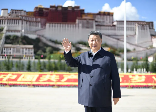 2021年7月21日至23日,习近平来到西藏,祝贺西藏和平解放70周年,看望慰问西藏各族干部群众。图为22日下午,习近平在布达拉宫广场考察时,向游客和当地群众挥手致意。新华社记者 谢环驰 摄
