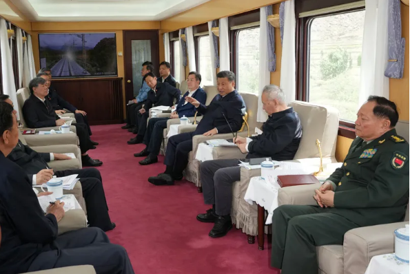 2021年7月21日至23日,习近平来到西藏,祝贺西藏和平解放70周年,看望慰问西藏各族干部群众。图为22日上午,习近平乘坐专列实地察看拉林铁路沿线建设情况,深入研究有关问题。新华社记者 李学仁 摄