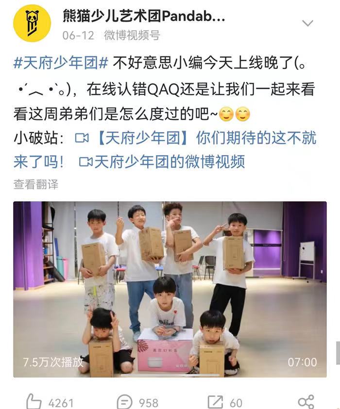 8月21日,“天府少年团”所属公司发文,强调公司不是把孩子当作赚钱的工具,而是在孵化具有时代意义的新一代少年榜样。