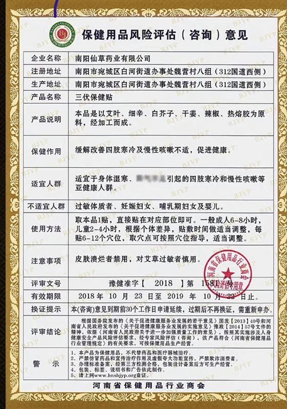 澎湃新闻注意到,和绿金家园的一些“三伏贴”产品一样,还有不少“三伏贴”打着保健品的旗号,使用的是河南省保健用品行业商会颁发的“豫健准字”、“豫健团标证字”这样的另类文号。