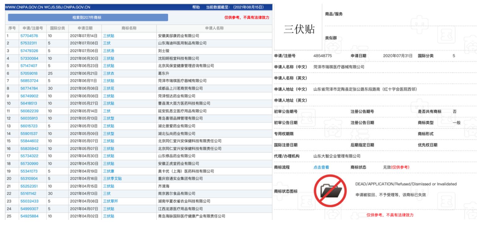 部分企业申请含“三伏”字眼的商标,但基本被驳回。截图自“中国商标网”