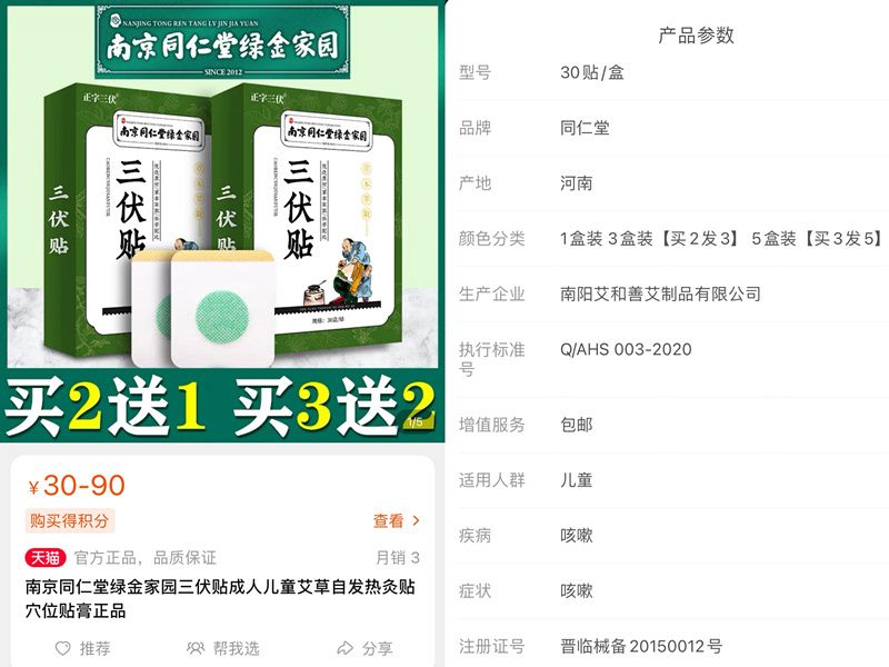 一家名为“好万众大药房旗舰店”的天猫店铺出售的“三伏贴”,产品属性一栏所填写的生产厂家为“南阳艾和善艾制品有限公司”,注册证号为“晋临械备20150012号”—— 这里“三伏贴”成了医械产品。