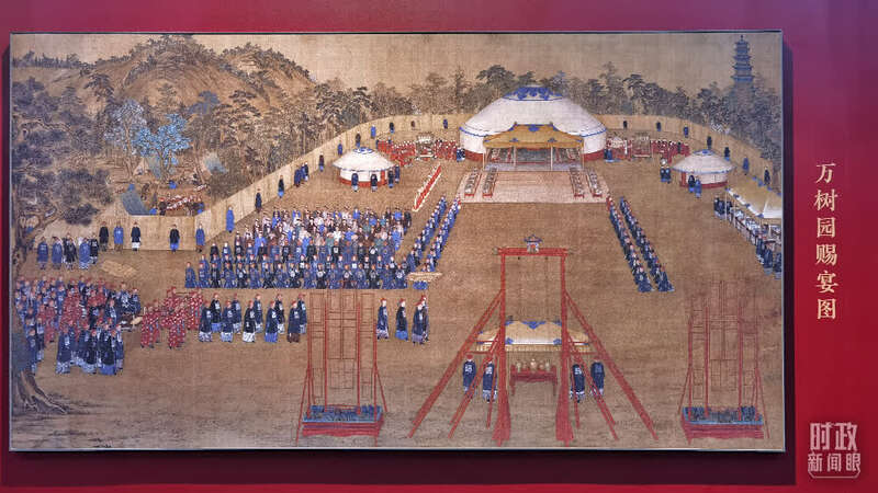 △承德博物馆展出的《万树园赐宴图》。避暑山庄万树园内有28座蒙古包,乾隆皇帝曾在这里接见蒙古土尔扈特部渥巴锡汗、六世班禅。(总台央视记者马立飞拍摄)