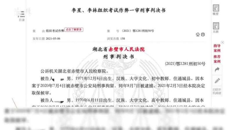 5月中旬,中国裁判文书网显示,湖北通城两教师于2020年6月收受学生家长5万元,协助高考作弊未果。 湖北赤壁法院判决,二人以组织考试作弊罪受到刑事处罚。