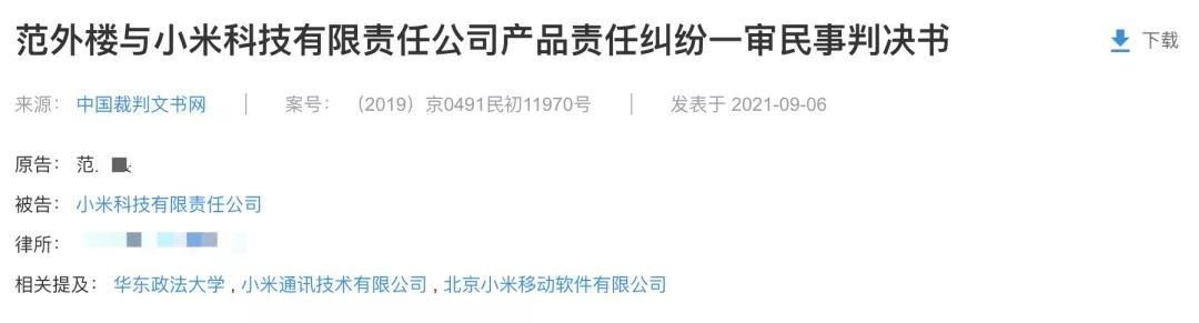 近日,范某与小米公司产品责任纠纷一审民事判决书公开。