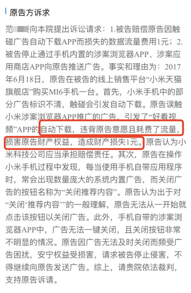 原告范某要求小米公司停止发送广告、赔偿因触碰广告自动下载APP而损失的数据流量费用1元。