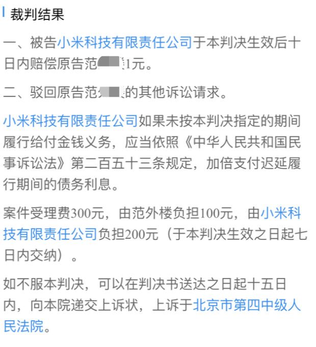 判决结果为,小米公司赔偿范某1元。