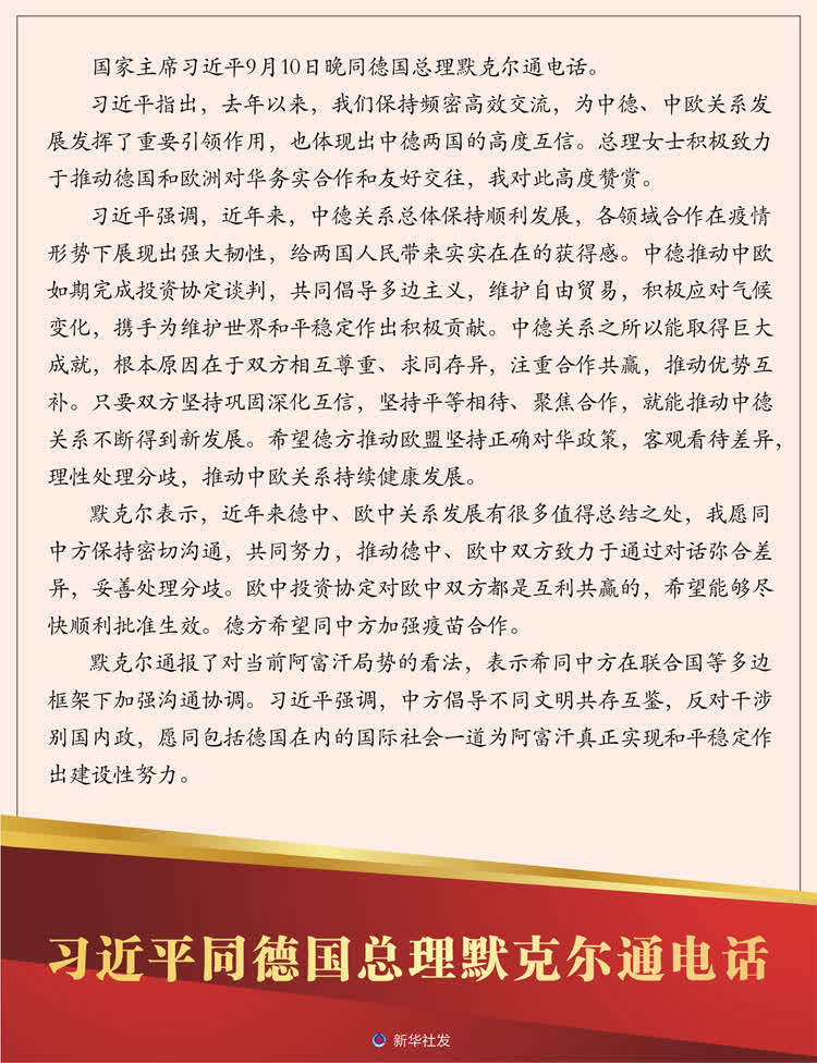 新华社北京9月10日电 国家主席习近平9月10日晚同德国总理默克尔通电话。