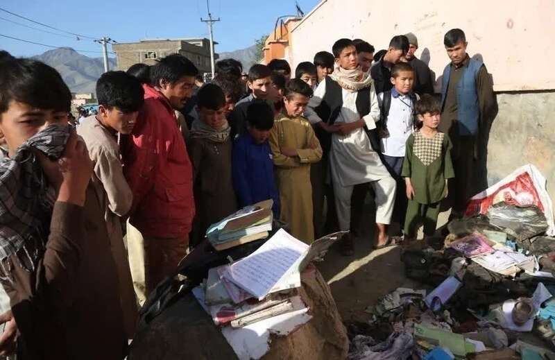 5月9日,在阿富汗喀布尔,人们站在遇难学生的物品旁。前一天发生在喀布尔一所学校附近的爆炸袭击造成超过50人死亡,另有逾百人受伤。新华社发(拉赫马图拉·阿里扎达摄)