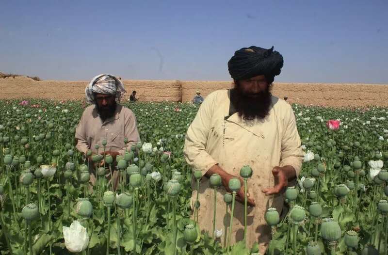 2019年4月4日,在阿富汗南部赫尔曼德省格里什克地区,阿富汗农民在罂粟田里劳作。新华社发(阿卜杜勒·阿齐兹摄)