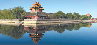 建筑色彩是造型的点缀。蓝天白云下,角楼金黄色的瓦顶流光溢彩,屋檐下青绿色的斗拱阳光不易照射,表现出一种阴柔之美,朱红的立柱与门窗尽显阳刚之气,洁白的台基给人高雅之感,而灰色的城墙呈冷峻威严之势,暗示强大的防守功能。角楼建筑整体与护城河中的倒影,共同构成一幅美丽的画卷,人造景观与自然环境完美融合。
