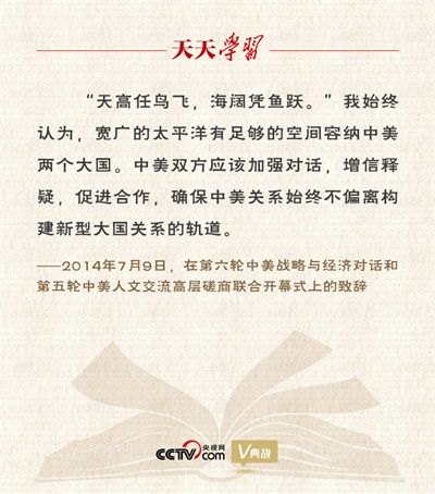 2014年,在第六轮中美战略与经济对话和第五轮中美人文交流高层磋商联合开幕式上,习近平主席发表了题为《努力构建中美新型大国关系》的致辞,他引用 “天高任鸟飞,海阔凭鱼跃”,指出中美两国的发展空间和前景巨大,应该加强对话,增信释疑,促进合作。