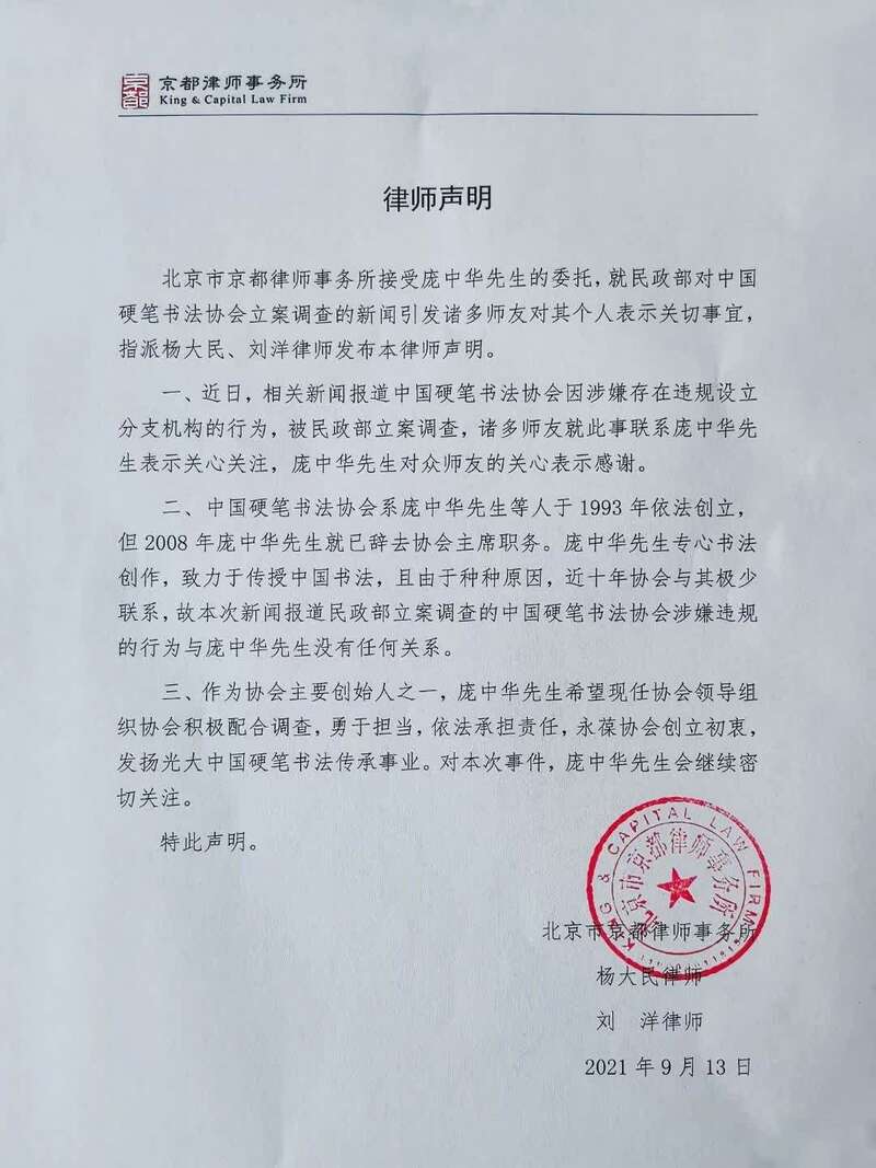9月13日,庞中华委托律师,就民政部对中国硬笔书法协会立案调查的新闻引发诸多师友对其个人表示关切事宜发表声明。声明指出,由于种种原因,近十年协会与庞中华极少联系,故中国硬笔书法协会涉嫌违规的行为与他本人没有任何关系。