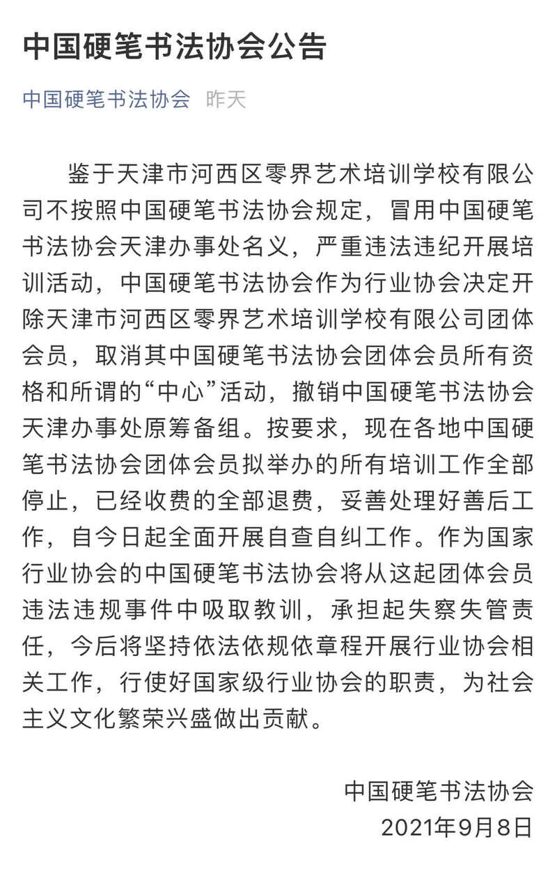 他还说:“在那之后,中国硬笔书法家协会违反规定设立分支机构、代表机构,从事营利性经营,早已背离了书法工作者的初心,也给书法艺术造成了极坏的社会影响。这件事反映出社会书法教育水平参差不齐,广大人民群众也缺乏判断,更充分体现了各地部分书法家协会和相关教育部门监管的缺位。”