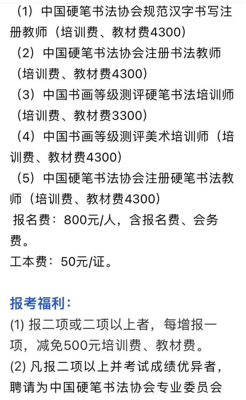 据封面新闻记者了解,“中国硬笔书法协会天津办事处工委”在一些网站上发布了将在今年10月举办培训认证的消息,并公布了报考科目及收费标准,包含中国硬笔书法协会注册书法教师资格证书、中国硬笔书法协会注册硬笔书法教师资格证书等,收费4000元至7000元不等。