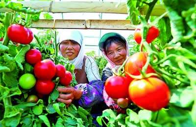 甘肃张掖高台县骆驼城镇永胜村,农户在采摘丰收的西红柿。王将摄/光明图片