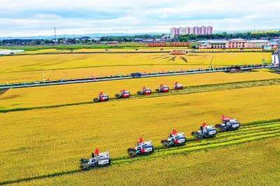 在吉林长春九台区龙嘉街道红光村,农民在进行水稻收割集中作业。新华社发