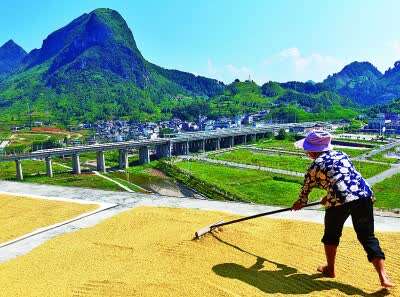 贵州三都县普安镇,农民在晾晒稻谷。新华社发