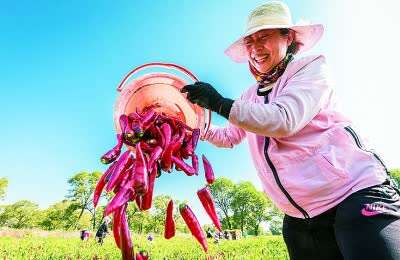 内蒙古呼和浩特玉泉区连家营村的农民在田间采收辣椒。丁根厚摄/光明图片