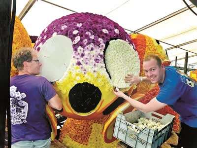 7月,所有团队纷纷开始搭工棚、制作花车的底模,这一阶段的工作强度大、技术含量高、艺术性强,比如焊接、混凝土浇筑、泡沫雕刻和糊纸浆、在底模上做一些艺术加工……这些任务基本由村里的青壮年来完成,大家协调分工、排班。来自“互相帮助”团队的管理人员John Van Doremalen说,从他还是孩子的时候,就参与大丽花车游行的工作,像现在的孩子一样去花田里采花;到了十几岁的时候,开始向父辈们学习制作花车。如今,他已是经验非常丰富的花车制作者了,现在也以同样的方式把技艺传给新一代的制作者。“我们津德尔特人,每一个人从小就开始学习花车制作,这是我们的传统,也是值得引以为傲的事情。”