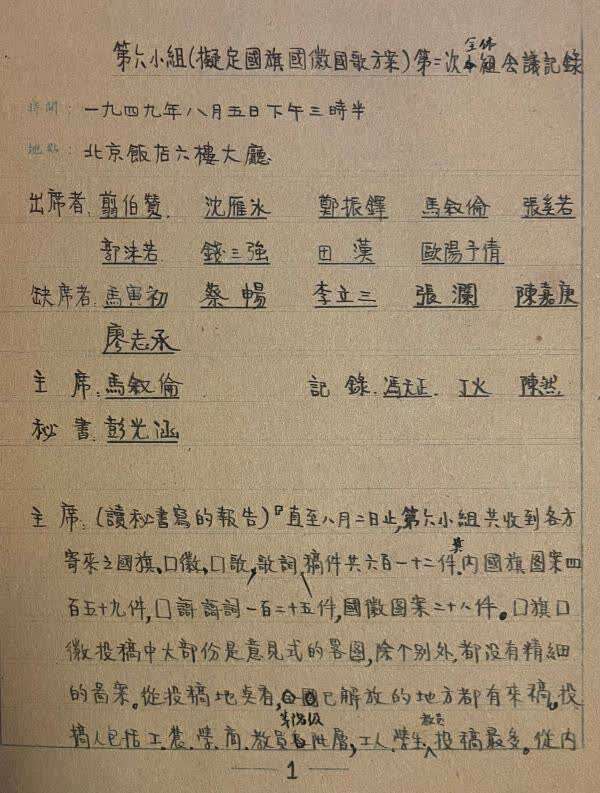 第六小组负责草拟国旗、国徽和国歌方案的档案记录
