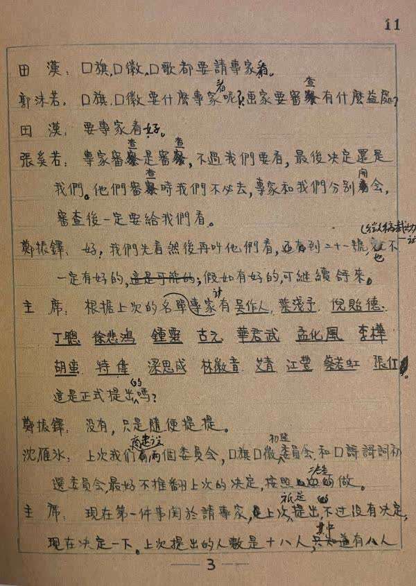 8月24日,第六小组召开第三次全体会议,马叙伦、张奚若、姚锦新、郑振铎、梁思成、翦伯赞、郭沫若、沈雁冰、叶剑英(马叙伦代)、廖承志(沈雁冰代)、田汉、钱三强、萧三、柯仲平、艾青、欧阳予倩等出席,不仅徐悲鸿未出席,且会议记录的缺席者马寅初、蔡畅、李立三、张澜、陈嘉庚中也没有徐悲鸿,不知是否可以说明徐悲鸿及马思聪、吕骥、贺绿汀等几位专家顾问,不在受邀参会名单中,或者,专家顾问即便因事缺席也不算缺席呢?不得而知。此次会议将复选出的国旗图案17幅编号,提请常委会审核;由于国徽应征稿件较少且无可采用的方案,拟另请专家拟制后再提请决定;复选歌词共13件,但均未臻完善,也交由文艺专家继续拟制,并提议在歌词确定后由常委会制定曲谱,再登报征求群众团体试唱后再作最后选定,“但需要经过相当时间,此种意见是否可以采纳请常委会决定”等等。