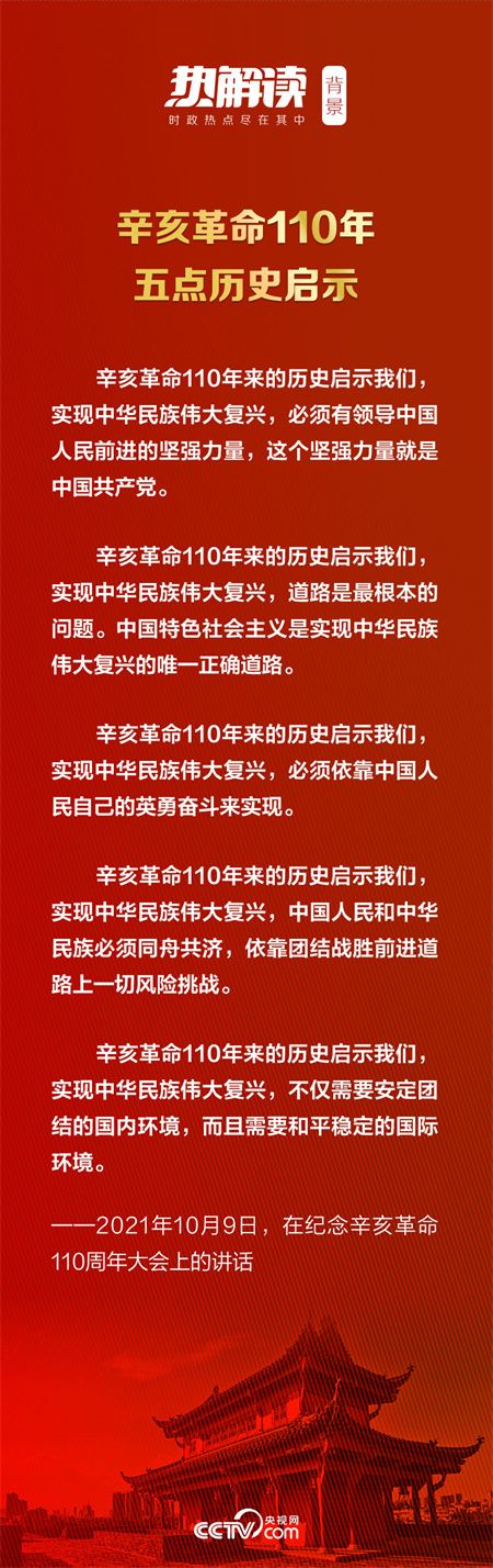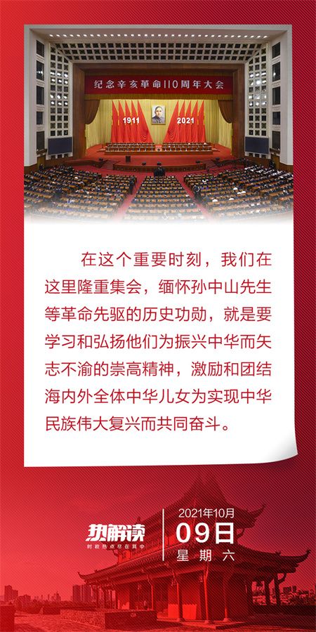 总书记在讲话中高度评价了辛亥革命的历史功勋,回顾了中国共产党团结带领中国人民取得的伟大成就,总结了辛亥革命110年来的历史启示,强调了祖国完全统一的历史任务,呼吁海内外全体中华儿女携手向着民族复兴的目标继续奋勇前进!