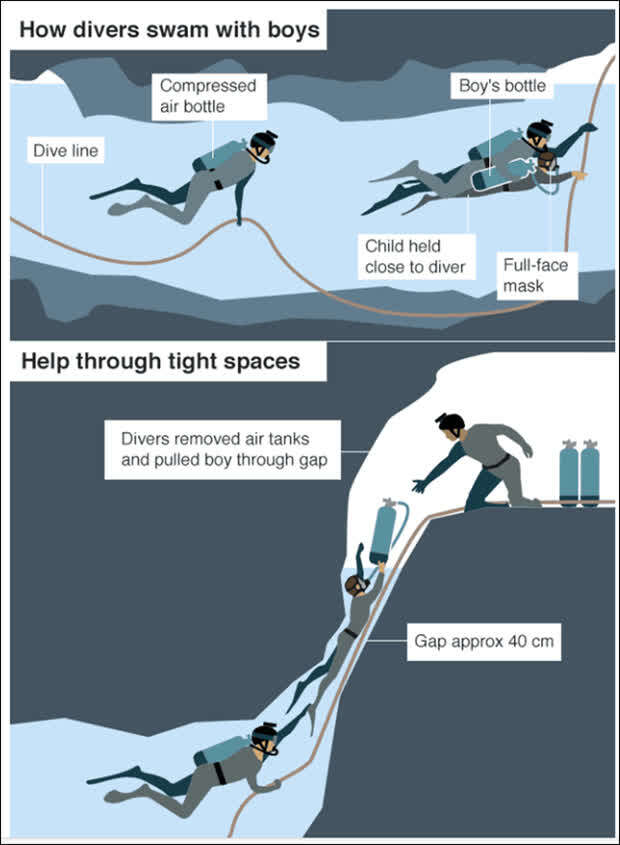 万万没想到,13人在进入洞穴之后不久,当地就下起大雨。雨水很快灌入洞穴并阻断了返回的道路,他们被迫前往更深处躲避,却最终被困在洞中。没有食物,他们只能依靠洞穴中滴落的水存活。一直到7月2日晚,也就是被困9天之后,救援人员才在距离洞口约4公里的地方发现了被困的人员。7月8日,在经过周密计划和精心准备之后,一场轰轰烈烈的大型救援行动正式展开。