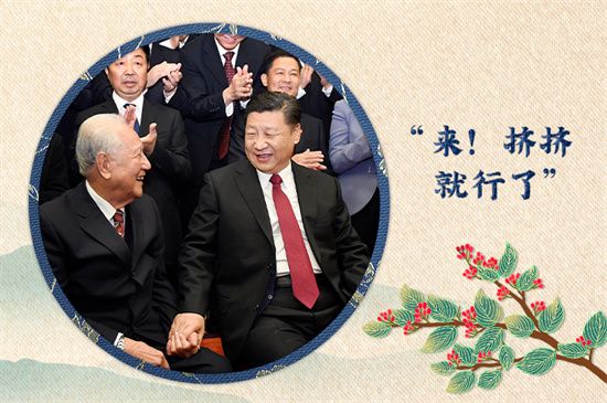 总书记拉着他们的手,请两位老人坐到自己身边来,两人执意推辞,总书记一再邀请:“来!挤挤就行了,就这样。”自然而然的举动,正是总书记尊老敬贤的真情流露。