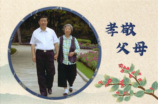 习近平孝敬父母,尽管公务繁忙,每当有时间他都会拉着母亲的手散步、聊天,春节不能和父母团聚,会用电话诉说愧疚、表达孝心。他的书架上摆着两张照片:一张是他与家人陪坐在轮椅上的父亲散步,另一张是他牵着母亲的手在院子里漫步。孝亲、敬老,体现在细微之处。