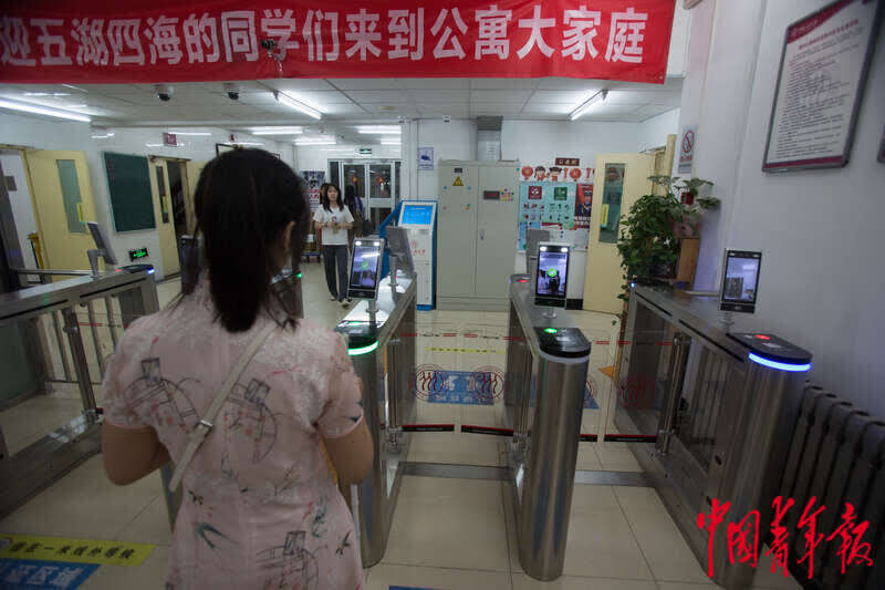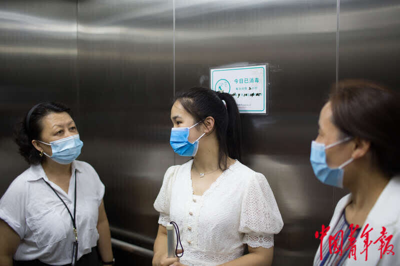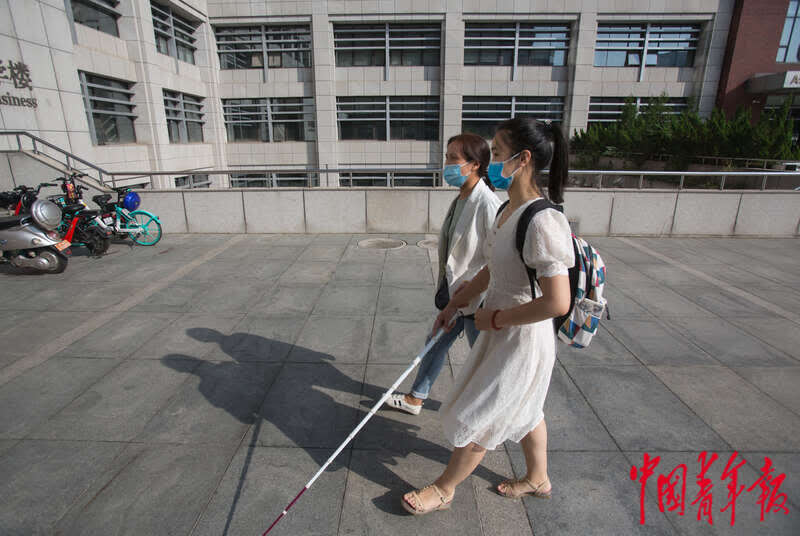 9月9日,北京,中国人民大学宿舍楼,文晴穿着藕粉色的改良旗袍走进宿舍,这是开学的第三天,为了方便文晴的日常活动,她的宿舍被安排在一层,进宿舍楼的道路也贴上了盲道地砖。王一凡/摄