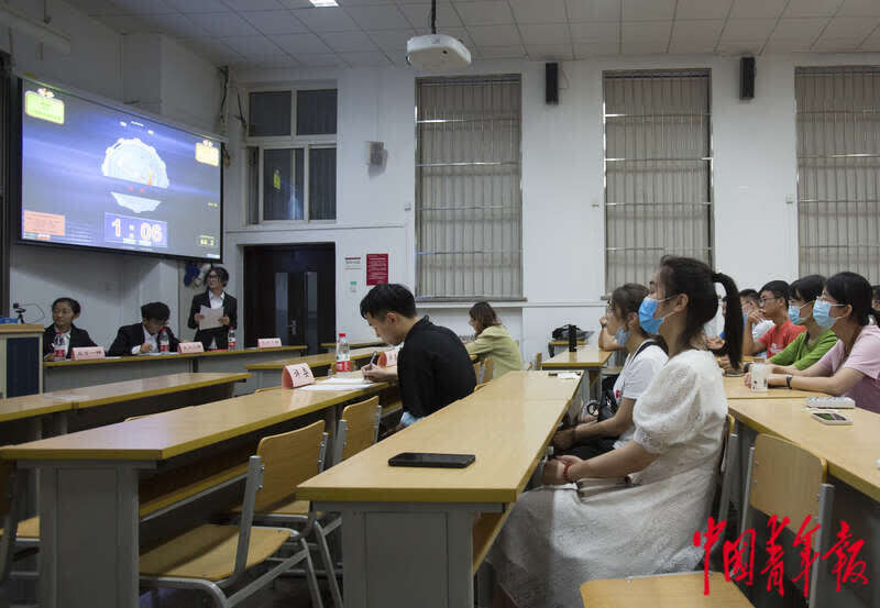 9月10日,中国人民大学,文晴和舍友们一起在教室内听招新辩论赛。 她想要加入学院的辩论队,即使研究生没有出席校内正式辩论比赛的机会,但她觉得参与辩论训练本身就很有意思。王一凡/摄