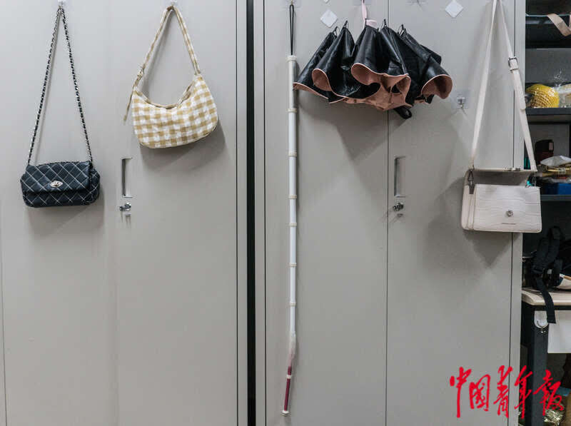 9月19日,中国人民大学,文晴的宿舍一角。在校园内行走时,一位同学在骑单车时不小心压断了盲杖的最后一节,在等待新盲杖运输送达的期间,朋友用胶带帮文晴先将旧盲杖粘了起来。王一凡/摄