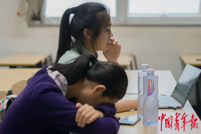 9月19日,北京市朝阳区,中国传媒大学教室,文晴和同伴正在为一场朗读大会做准备。在一小时的教学与练习后,同伴正在休息,文晴则在调试朗诵的背景音乐。王一凡/摄