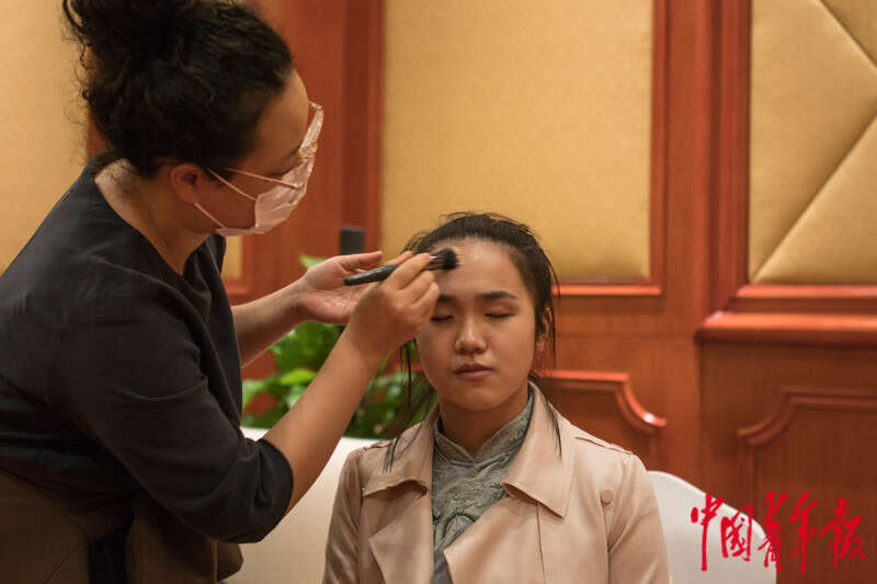 10月3日,北京市顺义区,国测国际会展中心内,朗读大会开始前,等待上台表演的文晴。她将与同伴一起朗诵余秋雨的诗歌《沙漠隐泉》。王一凡/摄