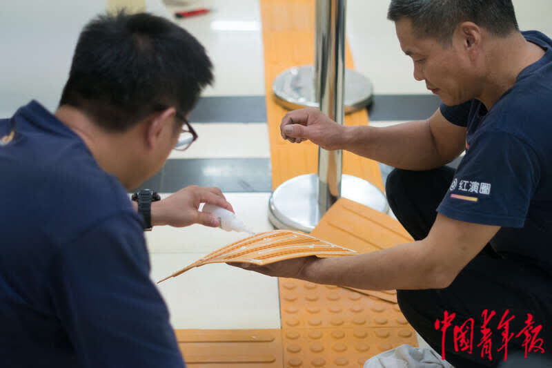 9月14日,北京,中国人民大学宿舍楼内,工人们正在铺设盲道指引贴。近百余块方形的盲道贴连接成一条分叉路,指引着闸机口、淋浴间、厕所、宿舍门等文晴常去的方位。王一凡/摄