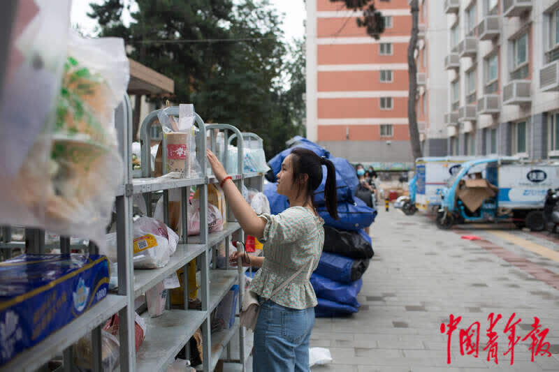 9月12日,中国人民大学,校园北门的外卖货架前,文晴尝试着点了一次外卖,学校的外卖货架上写了编号,她就通过触摸货架与货架之间的间隙进行分辨。王一凡/摄