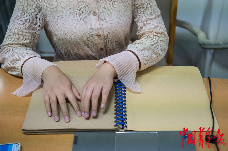 9月28日,北京,中国人民大学藏书馆的自习室内,周文晴通过手指触摸“阅读”盲文材料。王一凡/摄