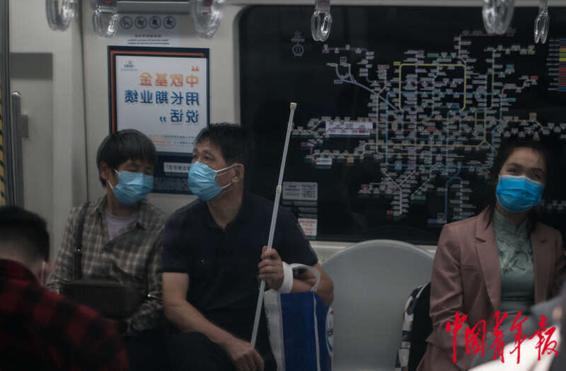 9月19日,北京地铁10号线上,文晴身旁坐了一对视力障碍、拿着盲杖的夫妇。王一凡/摄