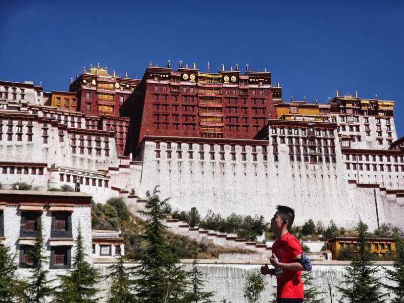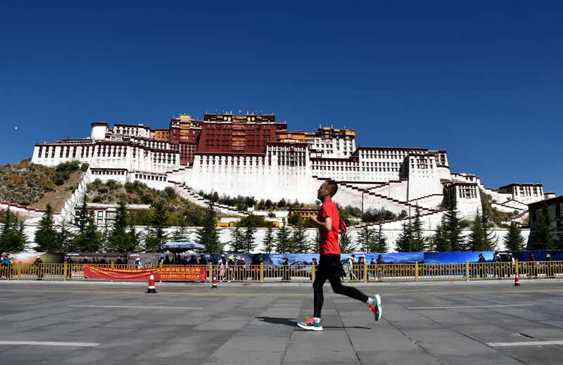 参赛选手在比赛中经过布达拉宫。新华社记者陈尚才摄