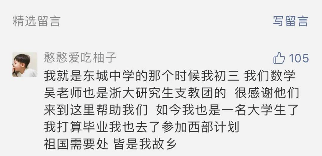 已被云南师范大学录取的自强班学生张磊说:“是浙大的老师让我坚定了在职中也能考上大学的信念,将来我还要继续攻读研究生。”景东县教体局资助中心主任马恩说:“研究生支教团开展爱在滇西助学,选拔贫困优秀的学生资助,他们像是一股春风,成为了受资助孩子们心中的榜样,更激发了景东学生要走出大山、考上大学的梦想。”